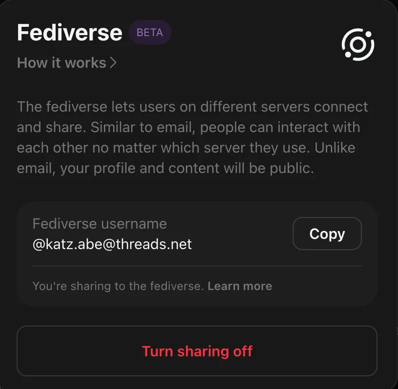 Shortly after its launch, Threads shipped the ability for users to “enable fediverse sharing.” Notably, this is not a default setting - users have to opt into it. I did.