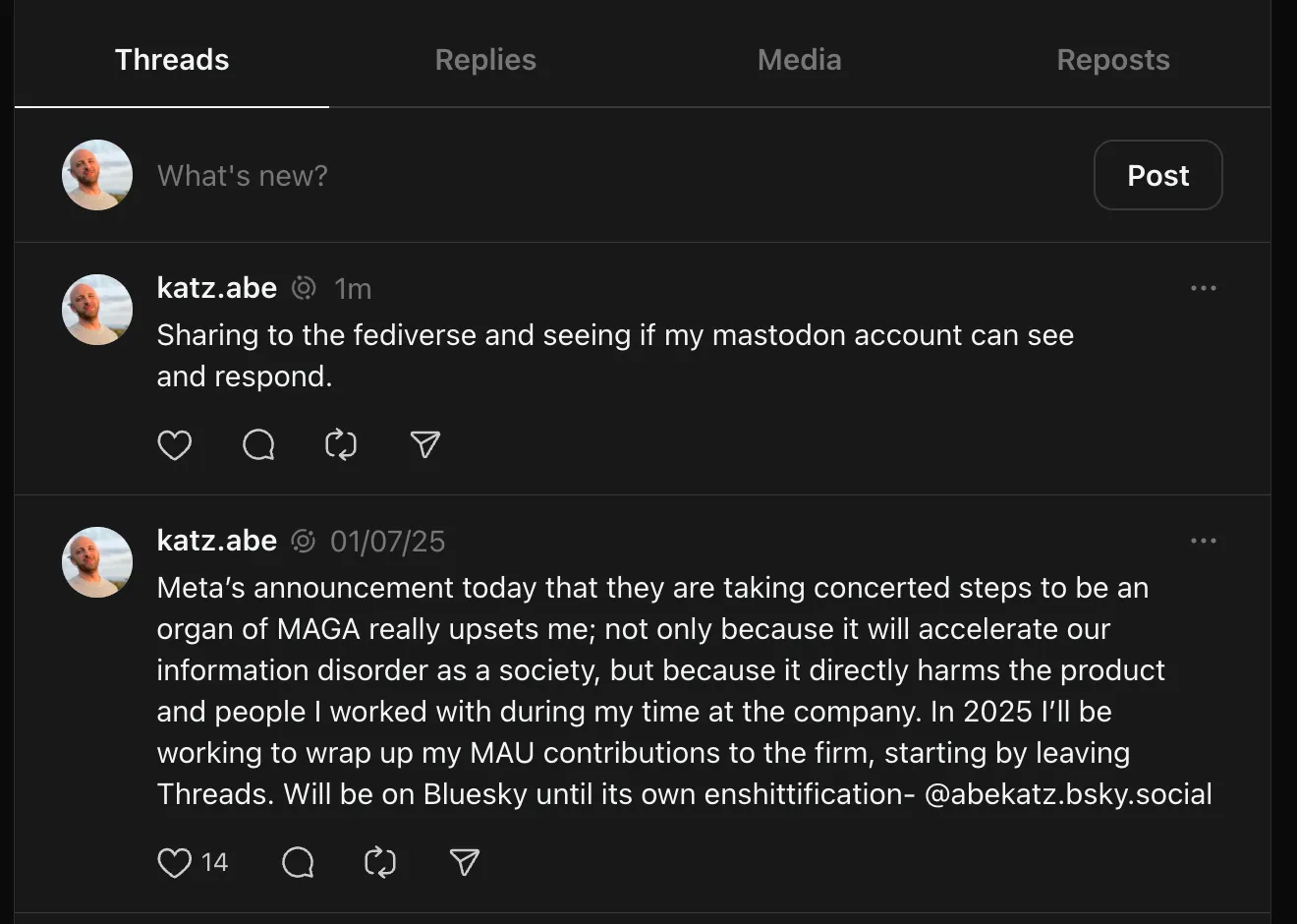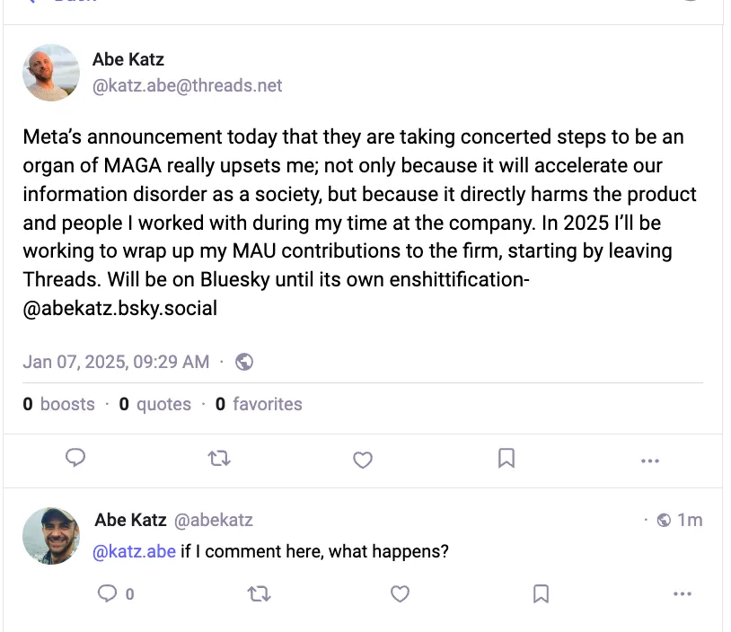 - Threads: When Musk acquired Twitter in the fall of 2022, there was a big emigration of Twitter users concerned with things like poor content moderation, political bias, and worse business models. True to its core business strategy, Meta (fka Facebook, Inc.) built a clone of Twitter in an effort to absorb a bunch of that new demand. Happily, they decided to build it on Rochko’s ActivityPub, marking the first high profile foray of a social tech “walled garden” into the fediverse. In the few years since, the Threads product roadmap has continued to inch along with further interoperability updates, but, as we’ll see, it doesn’t appear to be a major priority for them. My username on Threads is @katz.abe@threads.net. The dark screenshots below are from the perspective of my Threads user account.
