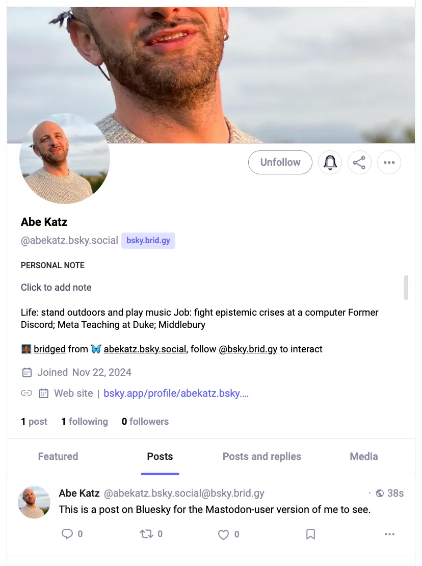 It didn’t pull in to Mastodon any previous posts I had made on my Bluesky account. So I made a new post on Bluesky, and after a few seconds I could see it from my Mastodon account when viewing the Bluesky user abekatz.bsky.social@bsky.brid.gy on Mastodon!