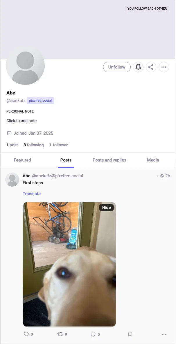 Then, on Mastodon, I searched for the username @abekatz@pixelfed.social, and followed it. And what did I see?