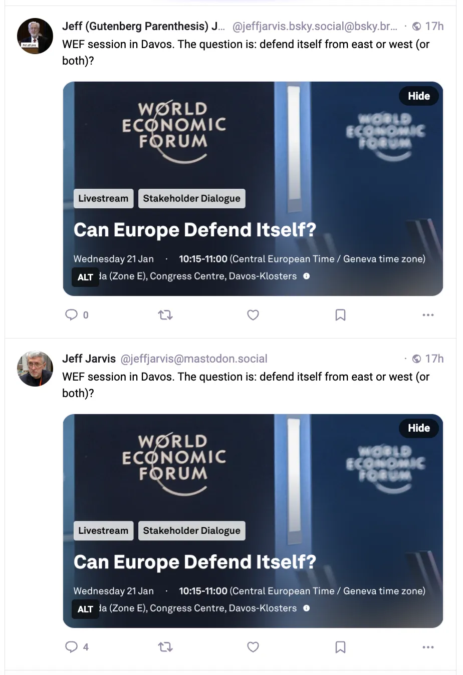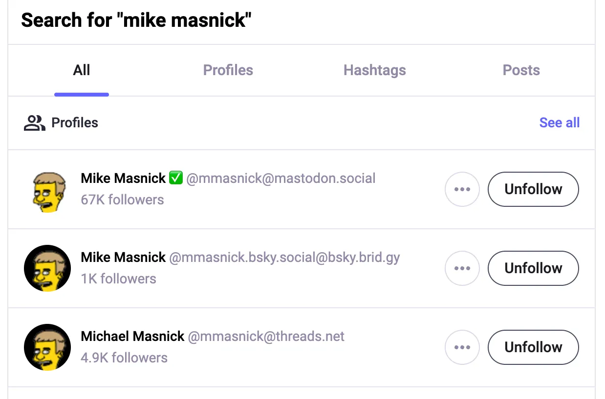 If, to be safe, I follow multiple versions of such a person, I might encounter some annoying UX. Some users post to multiple servers, in order to ensure that they’re reaching audiences who aren’t interoperating / combining products like I am. If I follow each of that person’s accounts, I’m going to see duplicative posts in my interoperating feed.