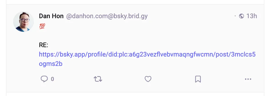 Rendering content (e.g. link embeds) from other places isn’t working yet. It means that a very popular behavior on microblogging services - the “quote tweet” - is DOA on certain interoperating products. In order to see the original content linked in this screenshot, I have to go to its service (Bluesky), which defeats the purpose of The Fediverse.