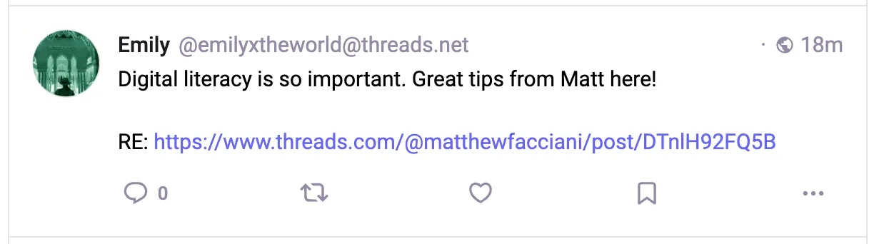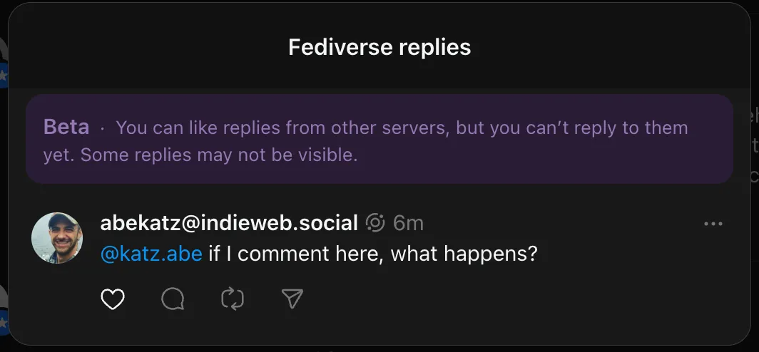 This is a mixed success. On the one hand, I can read Threads posts on something that isn’t Threads (Mastodon). On the other hand, I can’t really interact with Threads posts yet - such as commenting. This is not a technical limitation of ActivityPub, nor a shortcoming of Mastodon (as we’ll see below), but rather a matter of Threads configuring its instance and application a certain way.