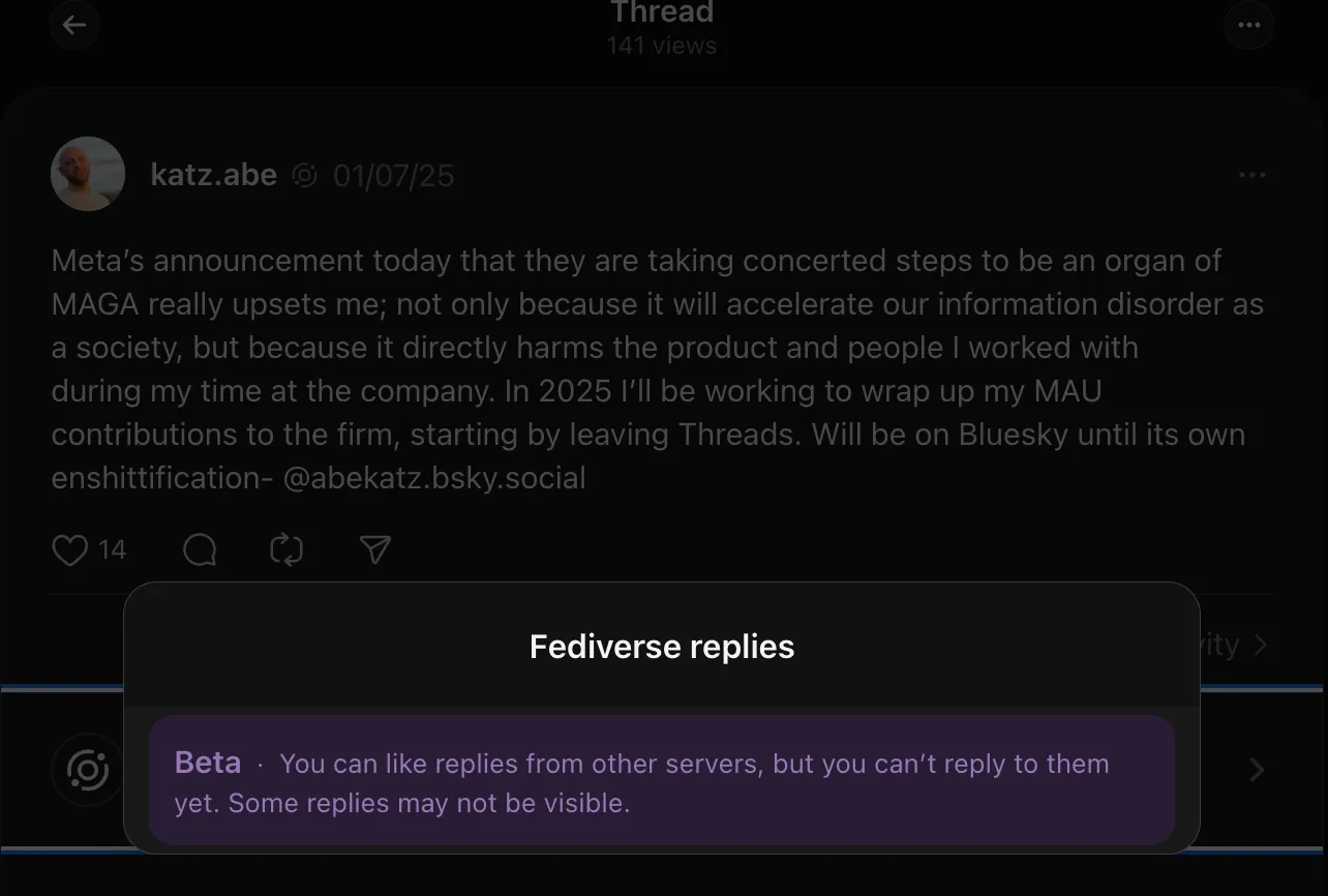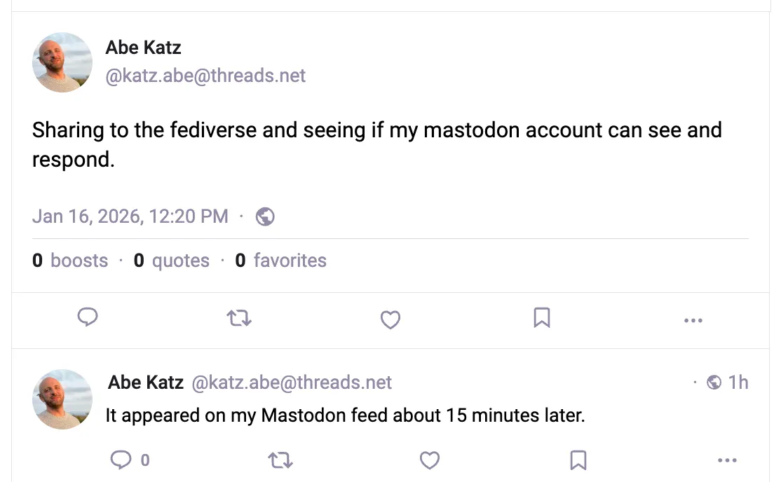 Today, on Mastodon I can see Threads posts; on Threads I cannot see Mastodon posts. This will always be a possible state of things, because each owner of an “instance” (a server) on the Fediverse can determine these kinds of message behaviors. It’s a very bad UX to see a post, assume you can interact with it, but find that nobody else on the other side of the wall will see your comments or reposts etc.