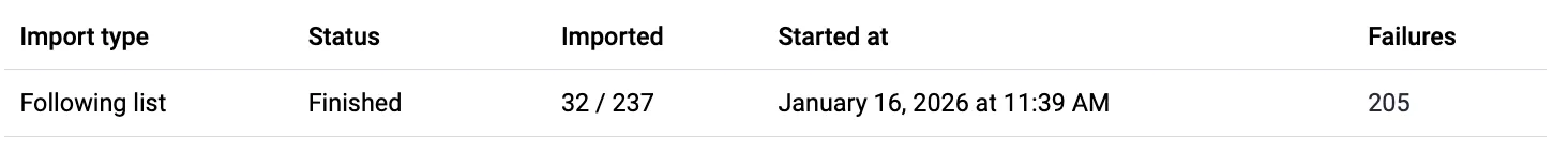 *Successful, insofar as I was able to solve a data transformation problem. But this screenshot, from Mastodon’s import page in my account preferences, shows that only 32 Threads accounts were successfully imported to my Mastodon as accounts I can follow. Those 205 failures? Threads accounts that have not yet enabled “Fediverse sharing.”