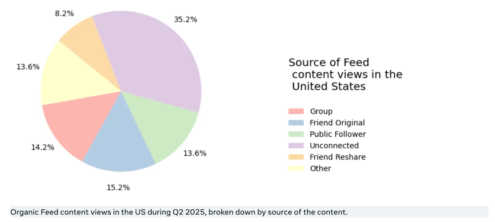 In the absence of reliable third party research into how social media networks are shaped, and how content moves through it, we rely on platforms’ own remarks on the topic. Take Meta’s Widely Viewed Content Report for the Facebook product, for example. Here’s their “where posts in Feed come from” graph from Q2 2025.